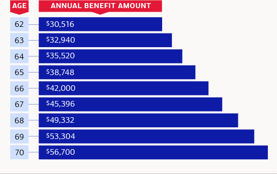 A hypothetical person who starts collecting Social Security at age 62 might have an annual benefit of $30,516. A hypothetical person who starts collecting Social Security at age 63 might have an annual benefit of $32,940. A hypothetical person who starts collecting Social Security at age 64 might have an annual benefit of $35,520. A hypothetical person who starts collecting Social Security at age 65 might have an annual benefit of $38,748. A hypothetical person who starts collecting Social Security at age 66 might have an annual benefit of $42,000. A hypothetical person who starts collecting Social Security at age 67 might have an annual benefit of $45,396. A hypothetical person who starts collecting Social Security at age 68 might have an annual benefit of $49,332. A hypothetical person who starts collecting Social Security at age 69 might have an annual benefit of $53,304. A hypothetical person who starts collecting Social Security at age 70 might have an annual benefit of $56,700.